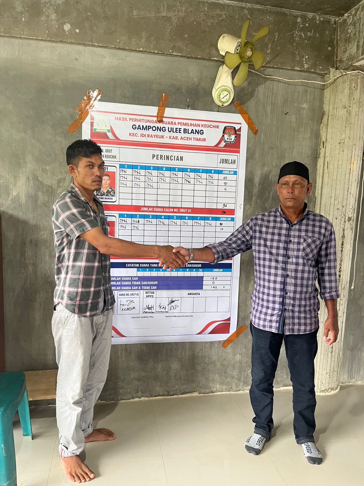 Aceh Timur, Gaoelnews.com – Fendi Mahera nomor urut 1 terpilih sebagai keuchik Gampong Ulee Blang kecamatan Idi Rayeuk Kabupaten Aceh Timur.