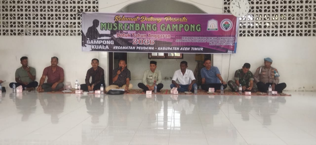 Aceh Timur, – GaoelNews.com – Gampong Kuala Peudawa Kecamatan Peudawa Gelar Musrembang dan Rembuk Stunting Tahun Anggaran 2026, Hadir dalam kegiatan Musrenbang Gampong Kuala Peudawa Kecamatan Peudawa, Bapak Camat Peudawa Adnan Sag, Bapak Danramil 16 Peudawa diwakili oleh Babinsa, Kapolsek Peudawa diwakili oleh babinkamtibmas,dan pendamping kecamatan Peudawa Mufazlal ST, Muhajir ST,Zulfan,dan ibu pengurus PKK Gampong dan kepala Puskesmas Peudawa dan perangkat desa Gampong.