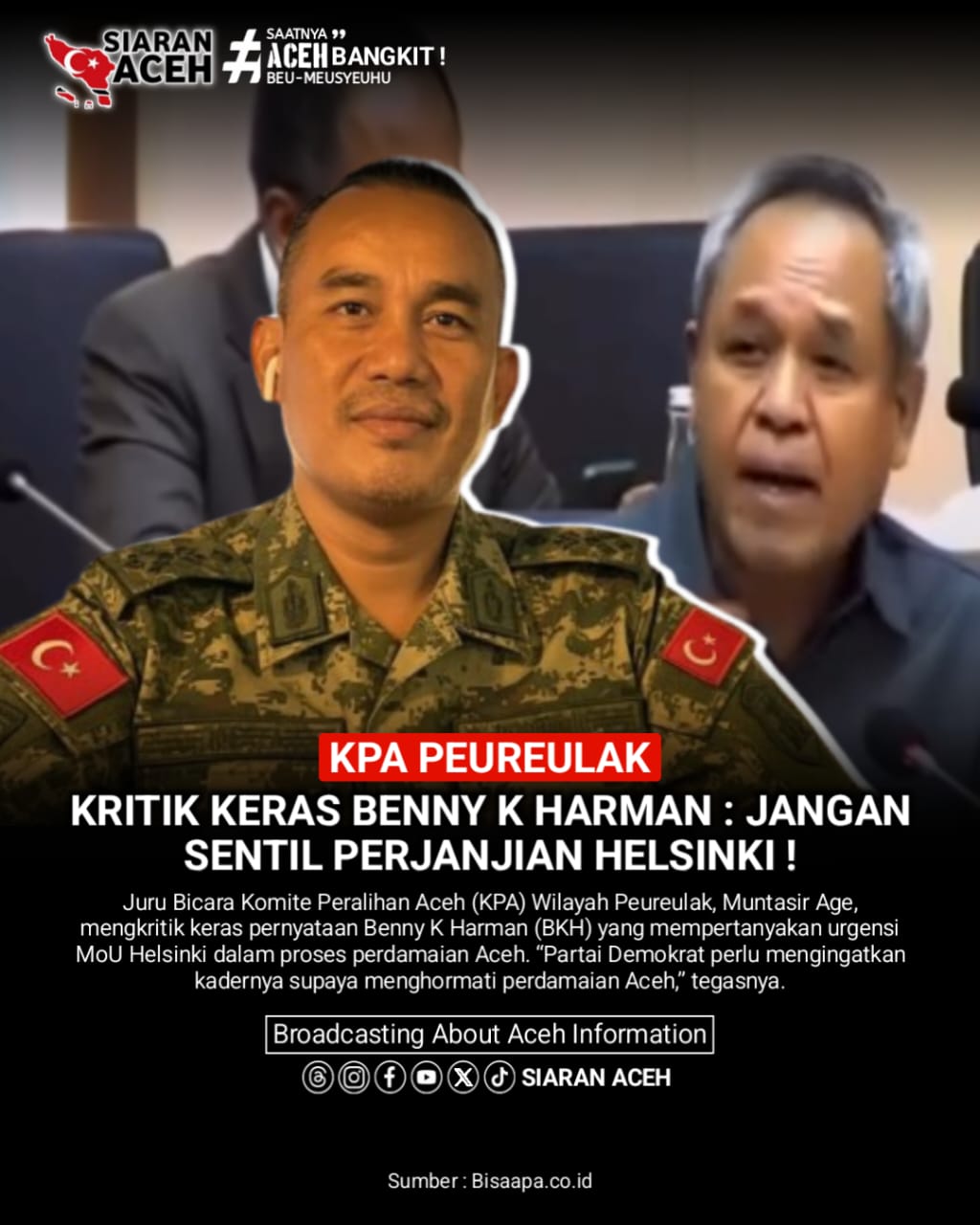 ACEH TIMUR – GaoelNews .com – Juru Bicara Komite Peralihan Aceh (KPA) Wilayah Peureulak, Muntasir Age, mengkritik keras pernyataan Benny K Harman (BKH) yang mempertanyakan urgensi MoU Helsinki dalam proses perdamaian Aceh.