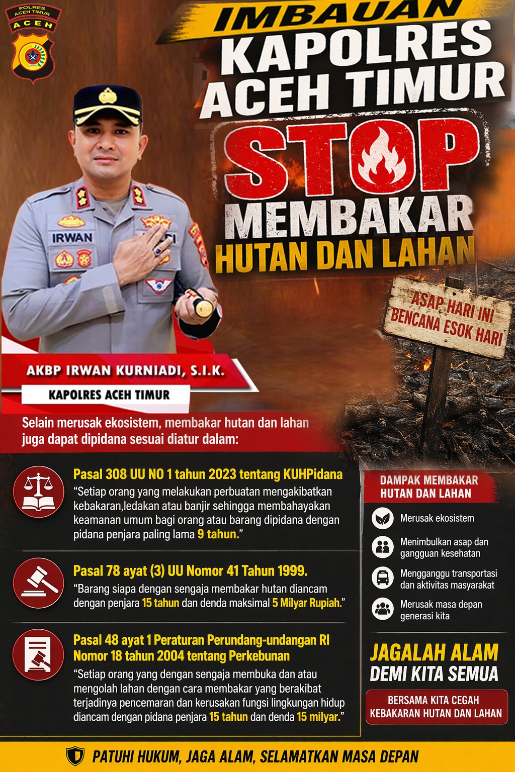 Kapolres Aceh Timur AKBP Irwan Kurniadi, S.I.K. mengajak seluruh masyarakat untuk tidak melakukan pembakaran lahan dalam bentuk apa pun. Selain itu, warga juga diimbau untuk segera melaporkan apabila menemukan titik api atau indikasi kebakaran di lingkungan sekitar.