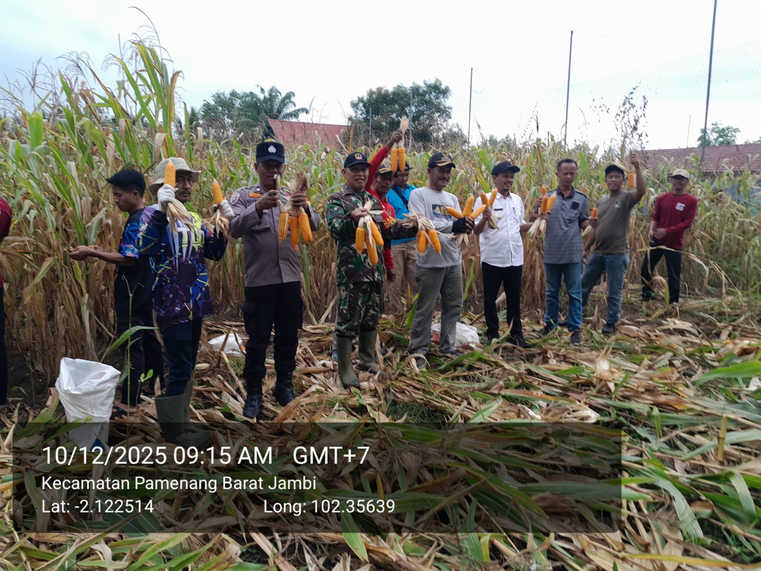Panen jagung ini dihadiri oleh Kepala Desa S. Arman, perwakilan Kapolsek Pamenang AIPTU Sutrisno, Babinsa, tokoh masyarakat, serta para petani. Kolaborasi antara pemerintah desa, aparat keamanan, dan masyarakat tampak nyata dalam kegiatan yang penuh kebersamaan tersebut.