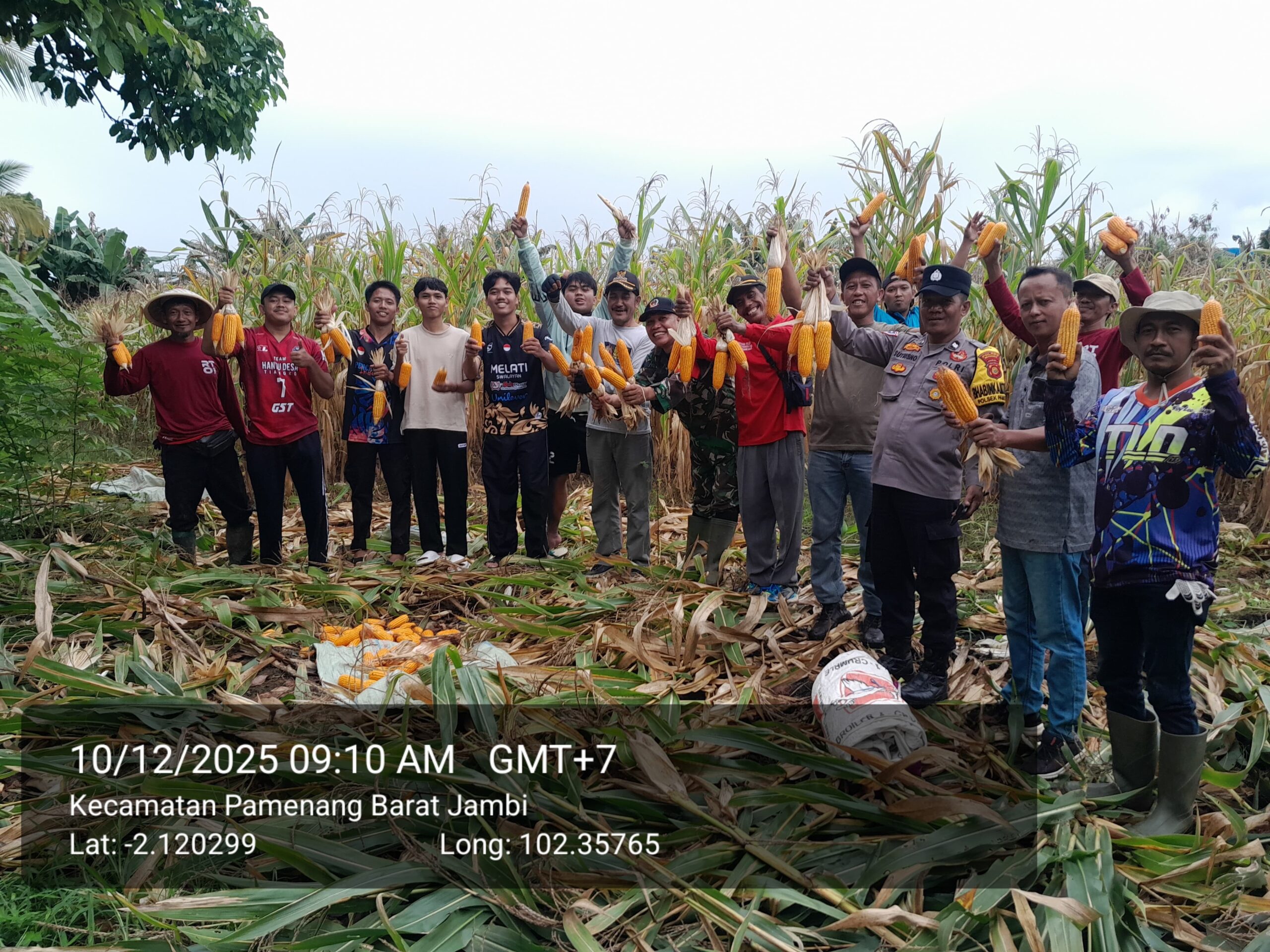Panen jagung ini dihadiri oleh Kepala Desa S. Arman, perwakilan Kapolsek Pamenang AIPTU Sutrisno, Babinsa, tokoh masyarakat, serta para petani. Kolaborasi antara pemerintah desa, aparat keamanan, dan masyarakat tampak nyata dalam kegiatan yang penuh kebersamaan tersebut.