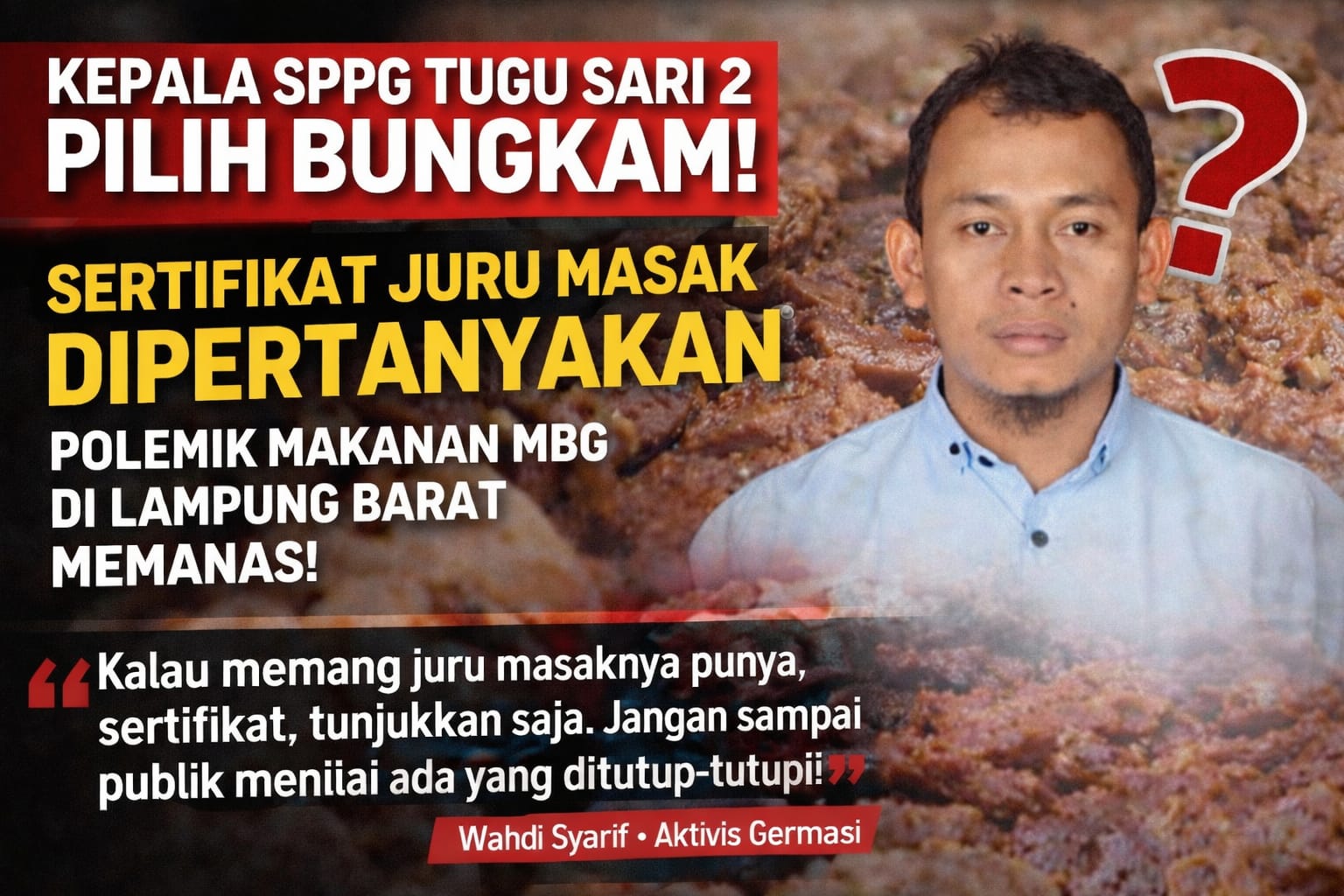 “Kalau memang juru masaknya punya sertifikat, tunjukkan saja. Jangan sampai publik menilai ada yang ditutup-tutupi,” tegasnya.