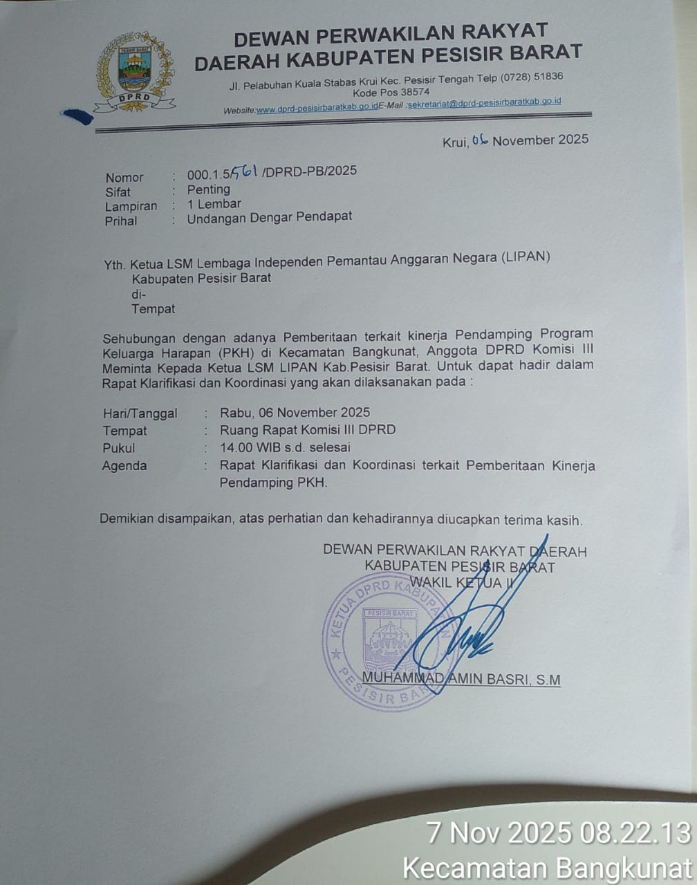 Pesisir Barat – GaoelNews.com – Ketua Lsm Lipan Lembaga Independen Pemantau Anggaran Negara kabupaten Pesisir Barat provinsi Lampung, menghadiri undangan resmi dari Komisi 3 DPRD pesisir Barat terkait pemberitaan kinerja pendamping pkh di kecamatan Bangkunat, terjadi prokontra perubahan data keluarga penerima manfaat (kpm) dari pkh.
