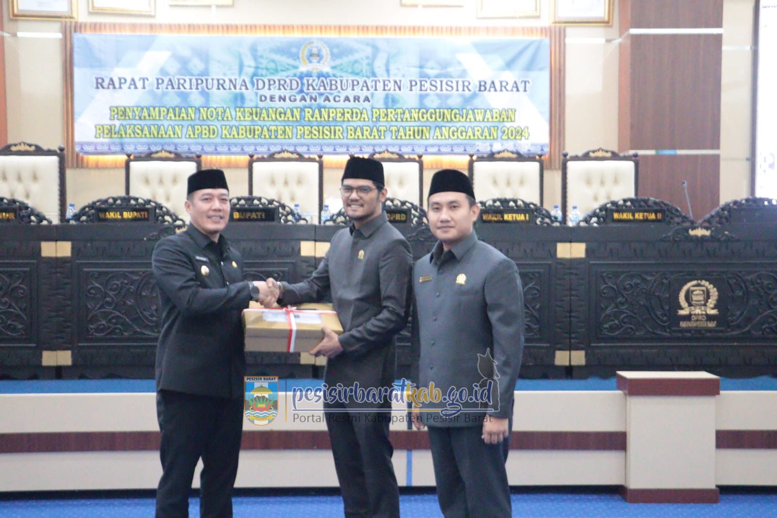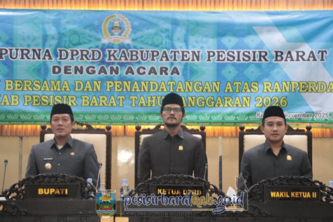 Bupati Pesisir Barat, Dedi Irawan, menghadiri rapat paripurna Dewan Perwakilan Rakyat Daerah (DPRD) dengan agenda persetujuan bersama dan penandatanganan atas Rancangan Peraturan Daerah (Ranperda) APBD Kabupaten Pesisir Barat Tahun Anggaran 2026. Rapat paripurna tersebut digelar di ruang rapat paripurna DPRD pada Jumat, 21 November 2025.