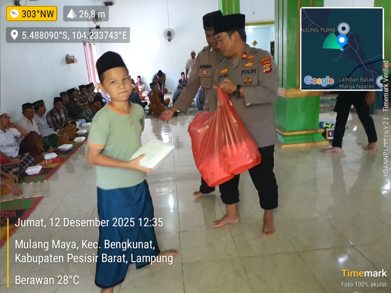 Pesisir Barat – Gaoelnews.com – Polsek Bengkunat melaksanakan kegiatan Jumat Keliling sebagai upaya mendekatkan diri dengan masyarakat, Jumat (12/12/2025). Kegiatan ini berlangsung di Masjid Al-Arif, Pekon Mulang Maya, Kecamatan Ngaras, Kabupaten Pesisir Barat.