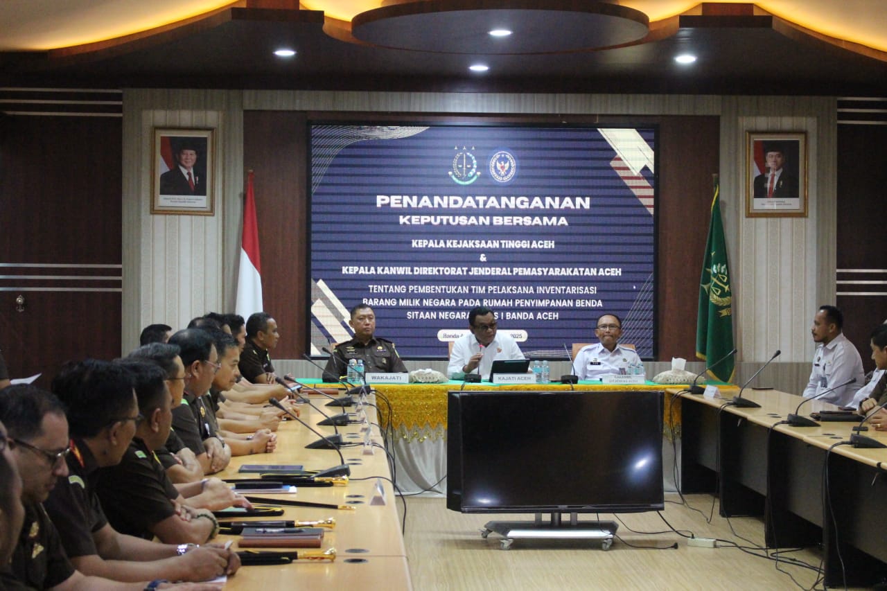 Banda Aceh – GaoelNews.com – Dalam rangka memperkuat sinergi antar instansi dalam pengelolaan Barang Milik Negara (BMN), Kepala Kejaksaan Tinggi Aceh bersama Kepala Kantor Wilayah Direktorat Jenderal Pemasyarakatan (Ditjenpas) Aceh secara resmi menandatangani Keputusan Bersama (SKB) tentang Pembentukan Tim Inventarisasi BMN pada Rumah Penyimpanan Benda Sitaan Negara (Rupbasan) Kelas I Banda Aceh, Rabu (12/11/2025).