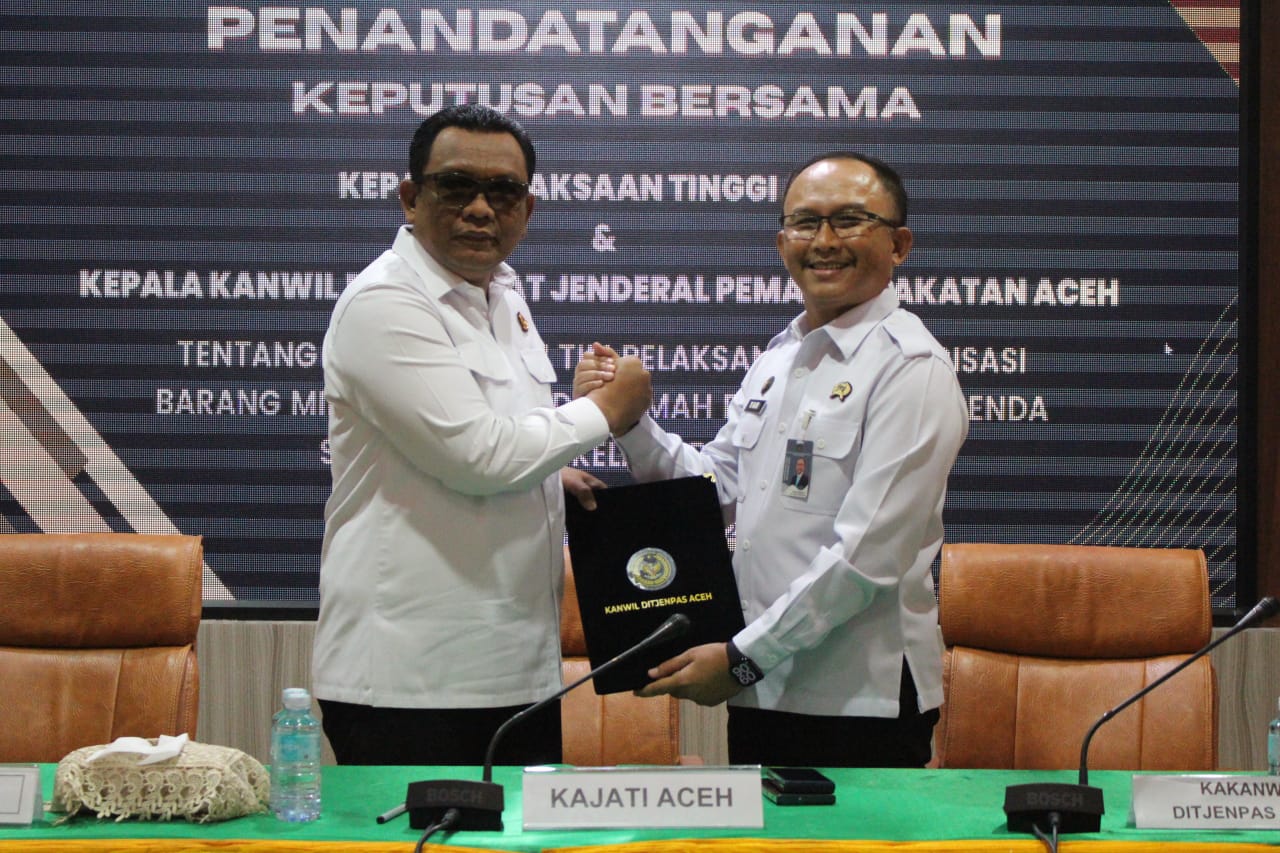 Banda Aceh – GaoelNews.com – Dalam rangka memperkuat sinergi antar instansi dalam pengelolaan Barang Milik Negara (BMN), Kepala Kejaksaan Tinggi Aceh bersama Kepala Kantor Wilayah Direktorat Jenderal Pemasyarakatan (Ditjenpas) Aceh secara resmi menandatangani Keputusan Bersama (SKB) tentang Pembentukan Tim Inventarisasi BMN pada Rumah Penyimpanan Benda Sitaan Negara (Rupbasan) Kelas I Banda Aceh, Rabu (12/11/2025).