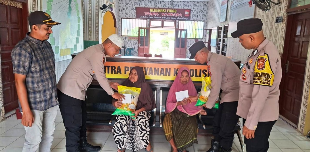 Santunan berupa 1 (satu) sak Beras SPHP 5 Kg dan uang tunai.disalurkan kepada anak yatim piatu dan kaum dhuafa oleh Kapolsek Pantee Bidari dan anggotanya.