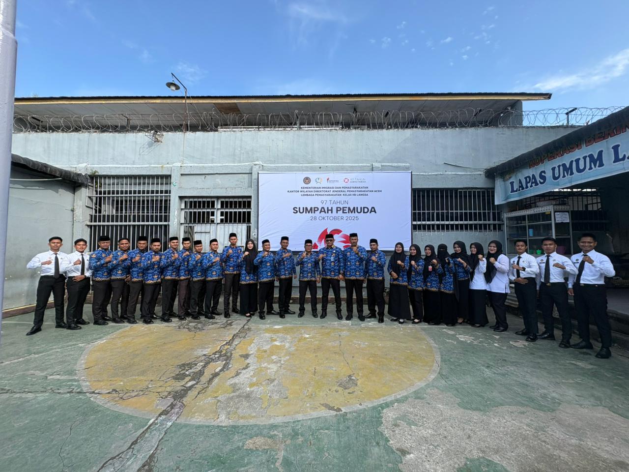 Langsa, GaoelNews.com – 28 Oktober 2025 — Lembaga Pemasyarakatan (Lapas) Kelas IIB Langsa melaksanakan upacara peringatan Hari Sumpah Pemuda ke-97 dengan khidmat di halaman lapas, Senin (28/10). Kegiatan ini diikuti oleh seluruh jajaran pegawai dan warga binaan pemasyarakatan.
