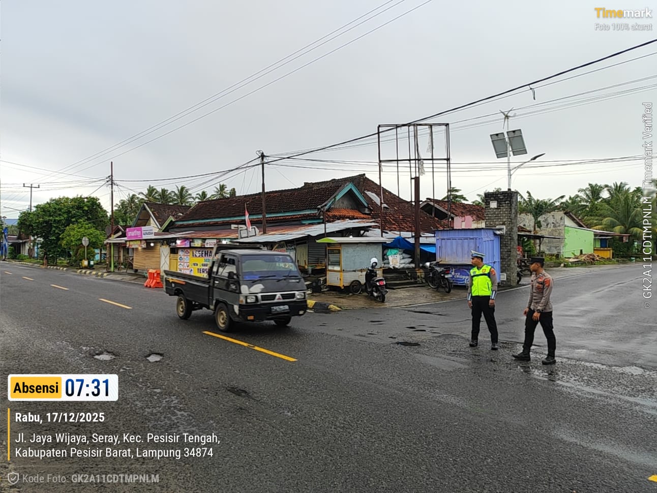 Polres Pesisir Barat Melaksanakan Kegiatan Pengaman (PAM) Rawan Pagi untuk menjaga Kamseltibcarlantas tetap berjalan kondusif di persimpangan Lapangan Terbang, Jln Lintas Barat, Kecamatan Pesisir Tengah, Kabupaten Pesisir Barat. Rabu (17/12/2025)