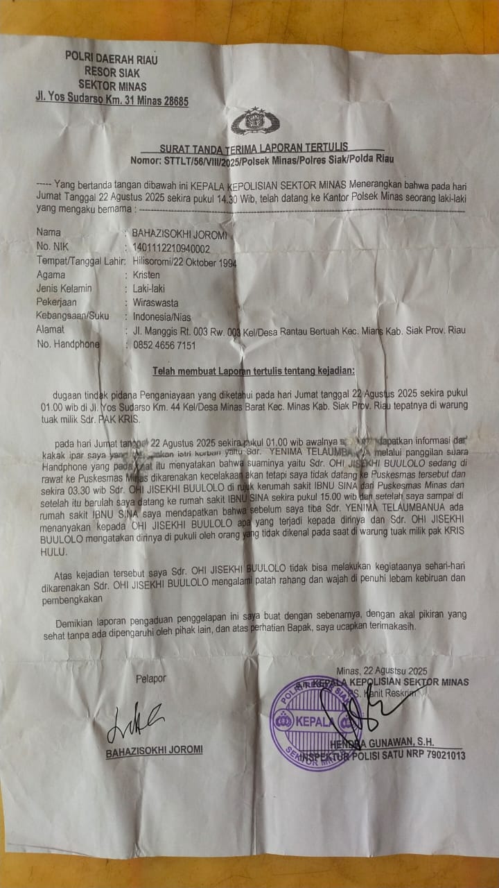 Menurut keterangan salah satu keluarga korban (Ohi Jisekhi Bu,ulolo) pada saat di wawancarai beberapa awak media, “terjadinya penganiayaan/pengeroyokan kepada Ohi Jisekhi Bu,ulolo pada Hari Kamis, tanggal 21 Agustus 2025, sekitar pukul 22:00 WIB disebuah warung tuak di km 44 Minas barat. Dengan kejadian ini beberapa keluarga dan bersama istri korban langsung mendatangi Polsek Minas untuk melapor. Lalu laporan kami diterima pada tanggal 22 Agustus 2025 sekira Pukul 01:00 WIB dengan nomor : STTLT/56/VIII/2025/Polsek Minas/Polres Siak/Polda Riau,” ucap salah satu keluarga korban kepada awak media, pada tanggal 30 September 2025.