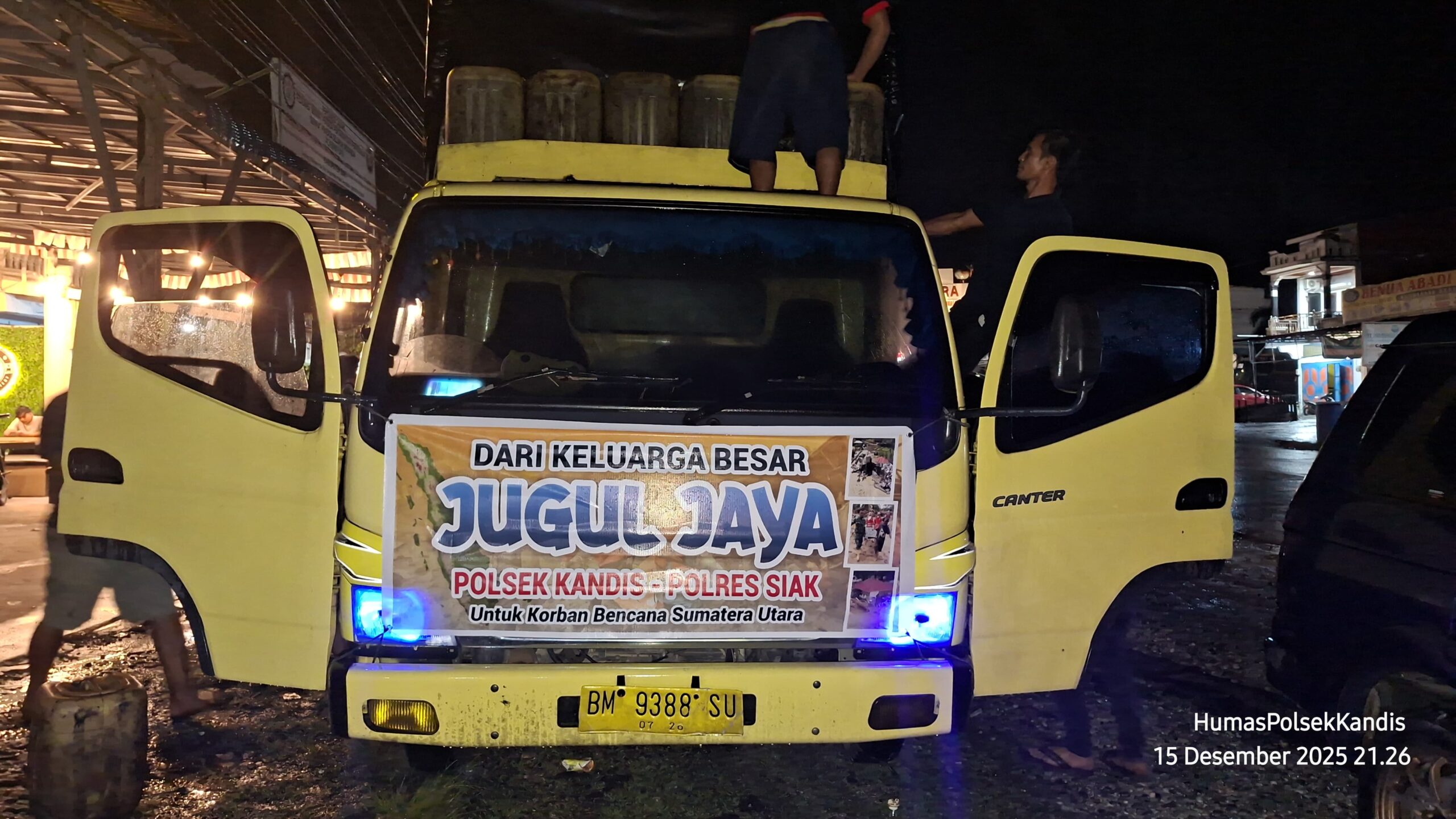 Siak,Kandis – GaoelNews .com – Kepedulian terhadap sesama kembali ditunjukkan oleh Polres Siak bersama keluarga besar CV. Jugul Jaya. Pada Senin malam, 15 Desember 2025, sekira pukul 21.30 WIB, bertempat di halaman Polsek Kandis, telah dilaksanakan kegiatan pelepasan bantuan kemanusiaan bagi korban bencana alam yang melanda wilayah Sumatera Utara, Sumatera Barat dan Aceh.